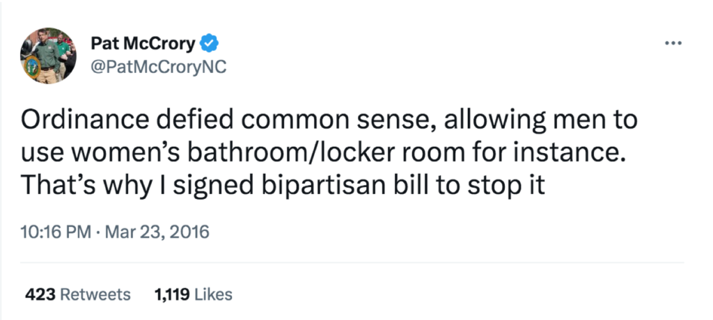 Pat McCrory, P.M. [@PatMcCroryNC]. (2016, March 23). Ordinance defied common sense, allowing men to use women’s barthroom/lockerroom for instance. That’s why I signed a bipartisan bill to stop it. [Tweet]. Twitter. https://twitter.com/PatMcCroryNC