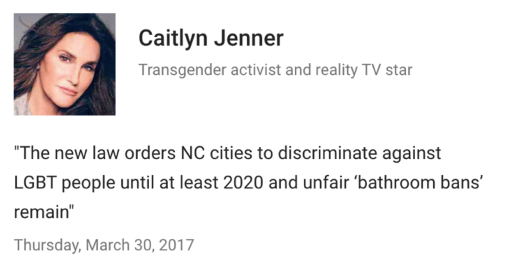 Smith, A. (2017, March 29). North Carolina Lawmakers Announce Deal to Repeal ‘Bathroom Bill’. NBC News. https://www.nbcnews.com/news/us-news/north-carolina-lawmakers-announce-deal-repeal-bathroom-bill-n740401